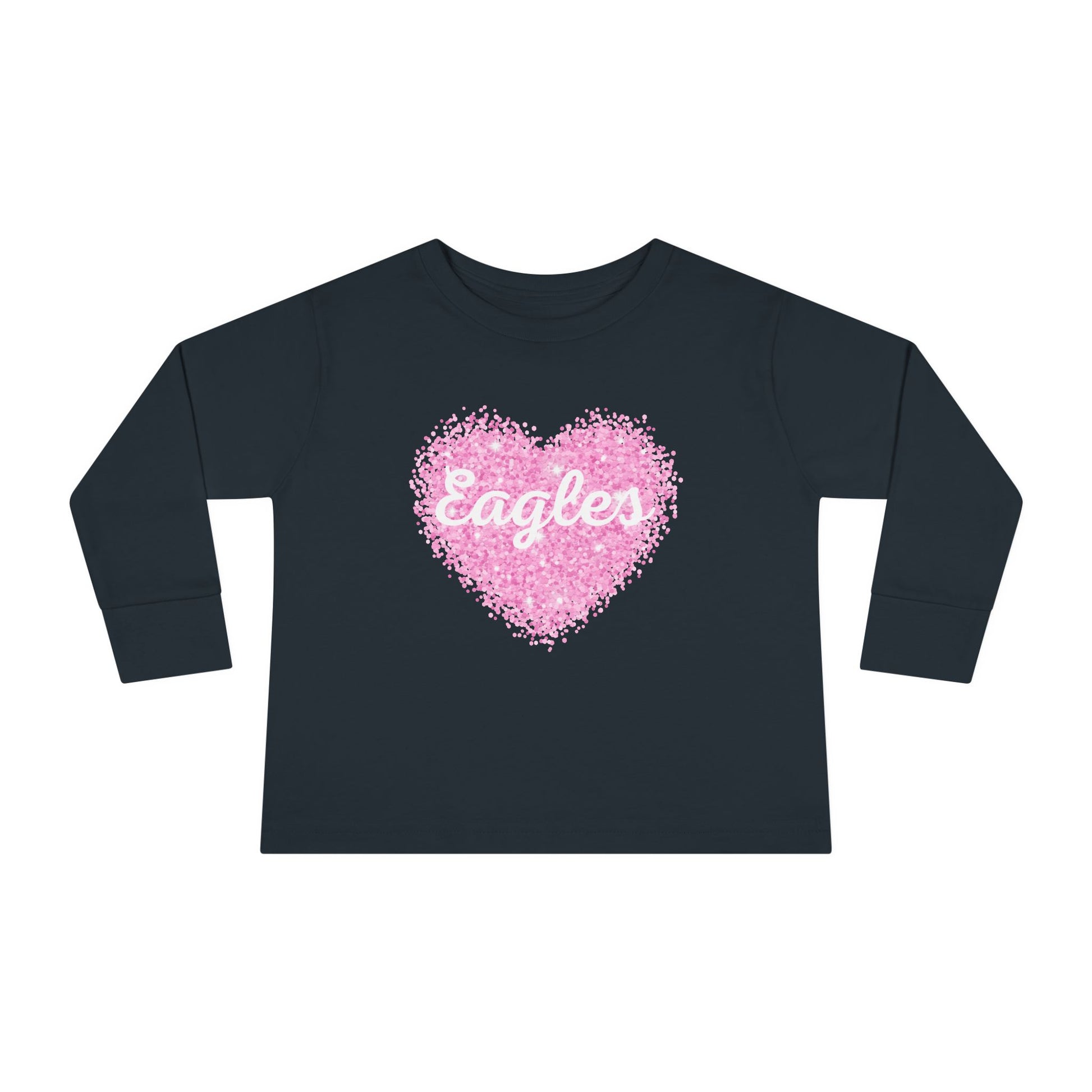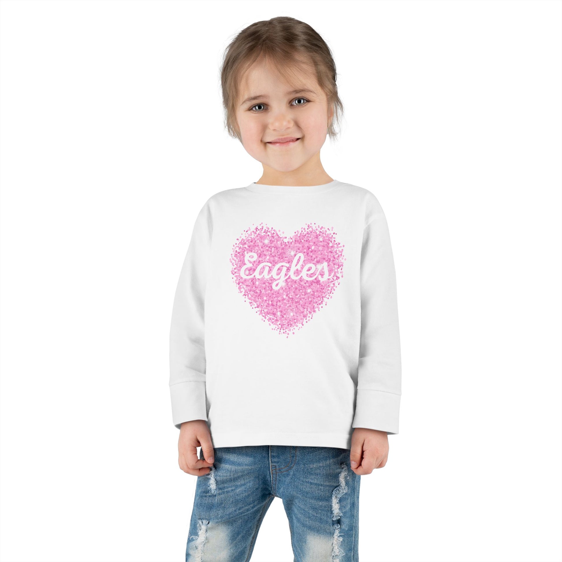 Soft, lightweight long-sleeve tee made for little ones who cheer, cuddle, and play. The white shirt features a hand-sketched pink heart made of tiny dots with the word “Eagles” nestled in the center — a sweet, slightly vintage look that reads like a tiny badge of team spirit or family nickname. The fabric drapes gently and the ribbed collar and cuffs keep the lines neat after wash-and-play sessions. Short, warm sentences for pulling on before preschool drop-off or layering under a jacket for chilly game days.