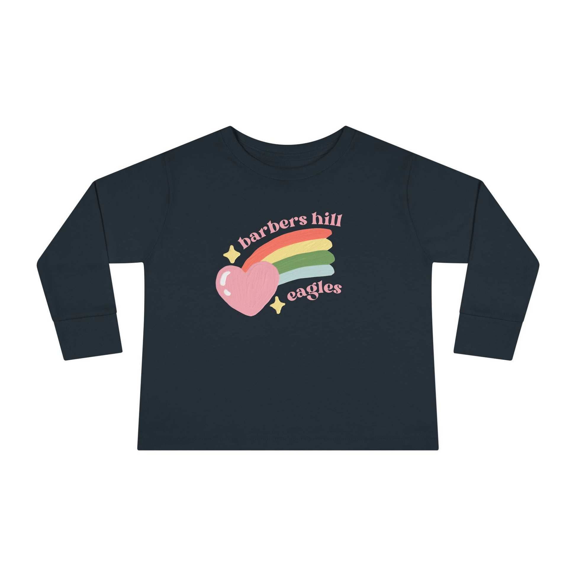 Bright, soft, and ready for playful days — this toddler long sleeve tee brings gentle color and comfy wear to little adventurers. A sweet heart and rainbow graphic sits across the chest in muted pastels, giving a nostalgic, storybook feel that reads like a tiny declaration of joy. The lightweight knit moves with active play and layers easily under jackets or overalls for cooler mornings. Clean ribbed cuffs and a reinforced neck keep the tee looking tidy after washes, while the tear-away label keeps it irritation-free against delicate skin. Whether for park mornings, cozy storytime, or family photos, this tee adds a cheerful, understated pop of color to everyday moments.