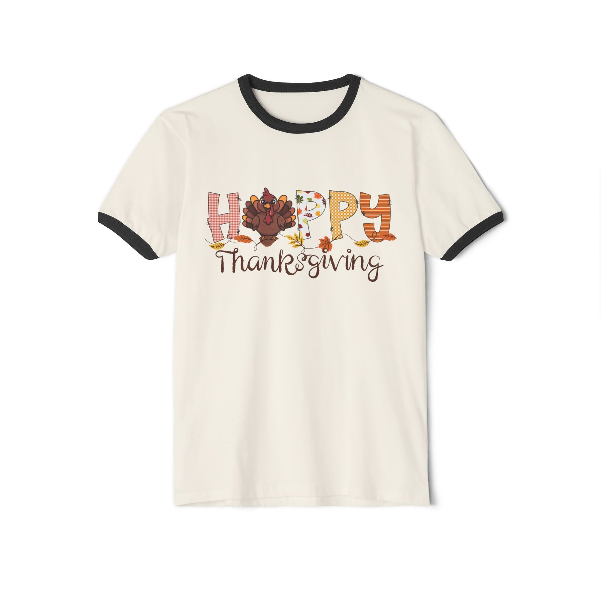 This soft ringer tee brings a cozy, autumn mood to your Thanksgiving gatherings. The cream body with contrasting black collar and sleeve bands frames a warm, hand-drawn “Happy Thanksgiving” design filled with fall motifs—pumpkins, leaves, and a little turkey—so it reads like a friendly note from the season. Lightweight and breathable, it layers easily under a cardigan or wears solo while you carve the pie, set the table, or chat with family on the porch. The classic fit and tear-away label keep comfort front and center, and the side seams hold the shape wash after wash. Wear it to anchor a relaxed holiday outfit that feels familiar and a little nostalgic.